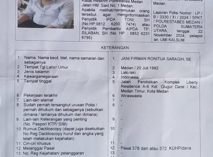 “Kuasa Hukum Minta Polisi Mengamankan Pelaku Secepatnya Medan-indonesiaeditorial,com Karena belum ditemukannya pelaku kasus penipuan/penggelapan sampai saat ini,...